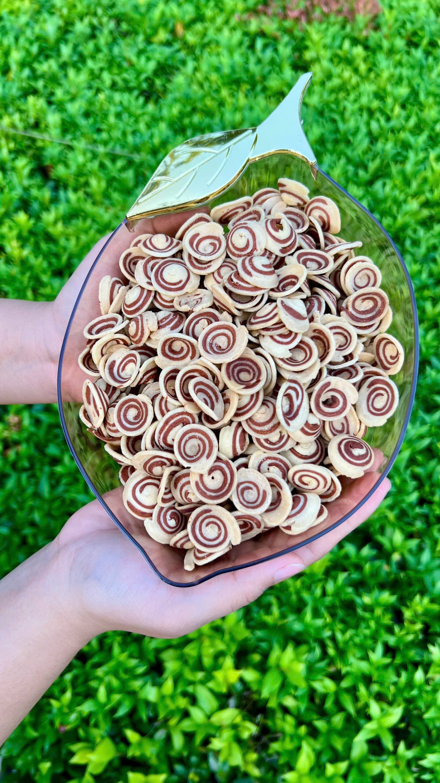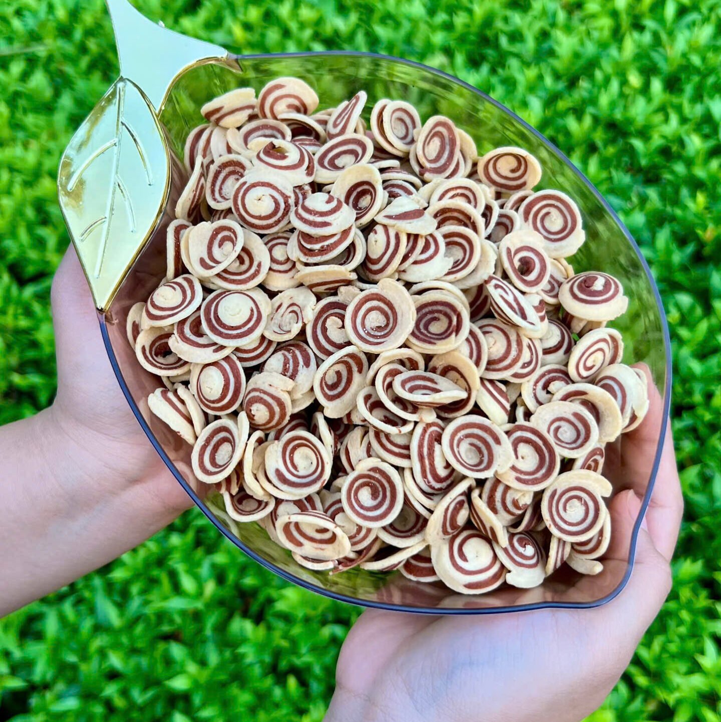 Bánh tai heo vị truyền thống là món ăn vặt quen thuộc với hương vị béo ngậy, giòn tan, mặn mà vừa phải, ăn hoài không ngán. Mỗi lát bánh được nhào nặn thủ công tỉ mỉ bởi những người thợ lành nghề, kết hợp giữa nước cốt dừa béo thơm và sữa tươi thanh dịu, tạo nên hương vị đặc trưng. Bánh có hình tròn mỏng, viền xoáy như tai heo, xen kẽ giữa hai màu trắng sữa và nâu nhạt, vừa bắt mắt vừa hấp dẫn. Khi cắn vào, cảm giác giòn rụm lan tỏa, thơm nhẹ vị dừa sữa, khiến từng miếng đều trở nên trọn vẹn. Bánh tai heo là lựa chọn lý tưởng cho những buổi tụ họp, những lúc thư giãn hay làm món ăn vặt tiện lợi cho cả gia đình.